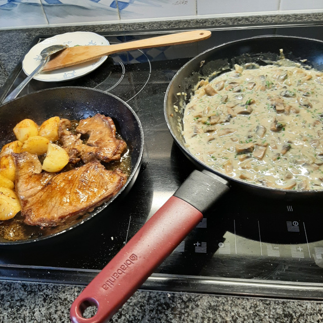 Saus: klont boter, 250 g champignons, 1 sjalot, 2 teentjes look, 1,5 dl room of light room, 1,5 dl water, ¼ verkruimeld bouillonblokje, peper, 1 el citroensap, 1 el fijngesneden peterselie