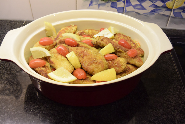 Afwerking: ½ citroen, 10 gehalveerde kerstomaatjes