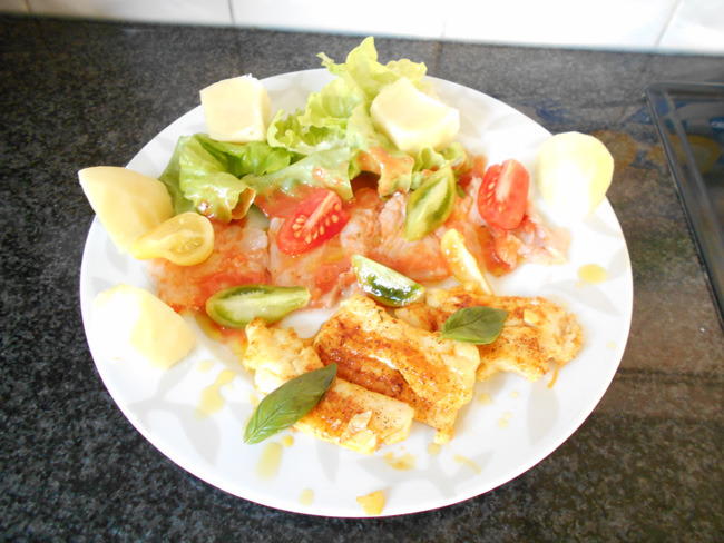 De gebakken vis ernaast en afwerken met kerstomaatjes en aardappelen.