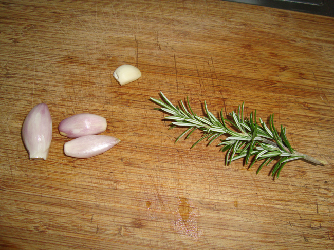 Geut olijfolie, 2 teentjes look, 1 sjalot, takje rozemarijn