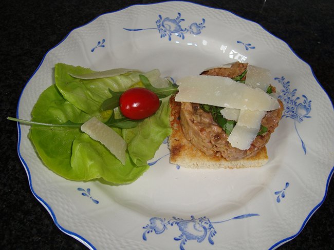 • Leg de toast op een bord, plaats een dresseerring op de toast en doe ¼ vlees erin, druk goed aan.