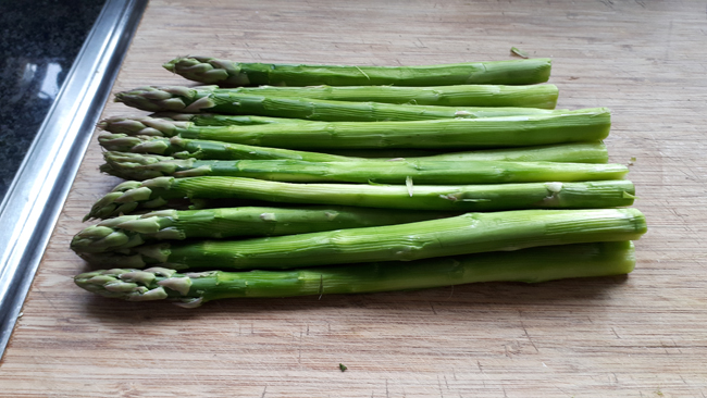 Het harde deel van de asperges snijden en in 5 minuten beetgaar koken in water met zout. Laat de asperges uitlekken en afkoelen.