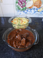 Neem het vlees van de botten, verwijder botjes en vel en snij in grote stukken. Doe in de saus en warm net voor het opdienen op.