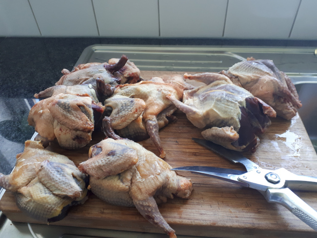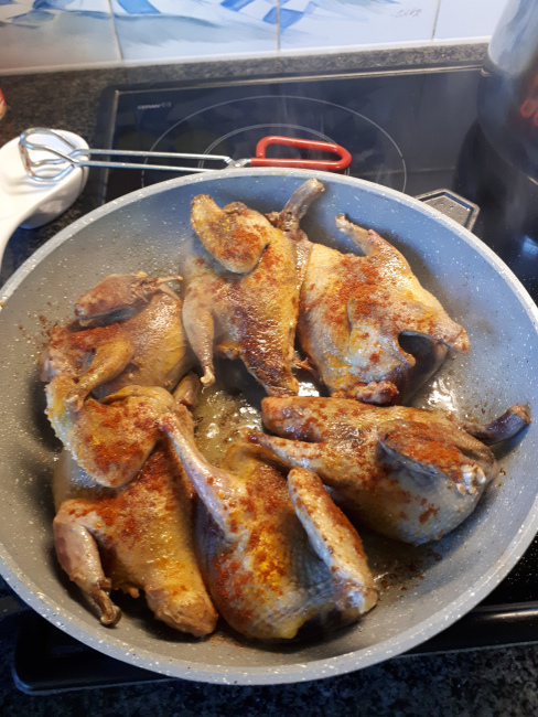 Geut olie, klont boter, 4 wilde duiven, peper, zout, paprikapoeder, kurkuma
