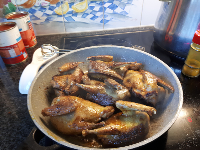 De duiven halveren, in een mengsel van boter en olie aan alle zijden bruin bakken. Bestrooi ze gedurende het bakken met de kruiden. Je kan dit best deel per deel in een grote bakpan doen, ze vervolgens in een grote kookpan leggen.
