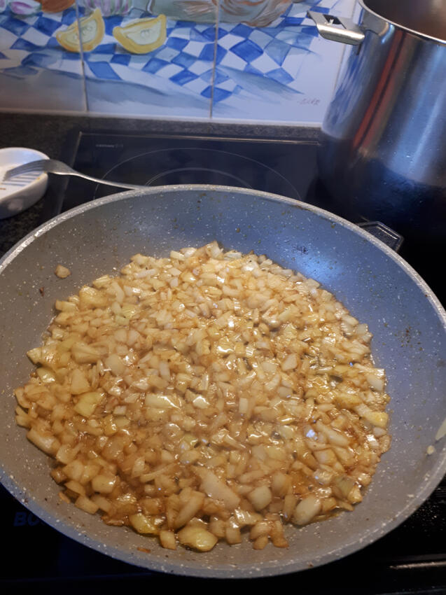 In een flinke geut olie de fijngesneden sjalot fruiten, voeg een snuif kurkuma toe. Voeg ook de rijst toe, roer zodat de rijst goed gemengd is met de olie.