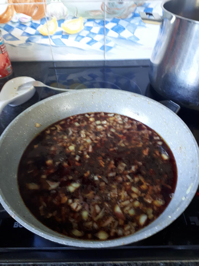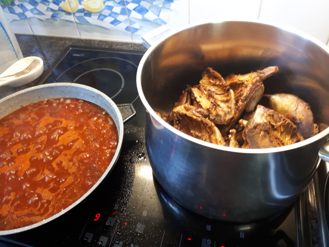 Snij ondertussen de ui fijn en fruit deze in het bakvet. Voeg de rode wijn toe en laat koken zodat de alcohol kan verdampen. Voeg de tomatenblokjes en de kruiden toe, breng aan de kook en giet dit bij de duiven, in de grote kookpan. Voeg water toe tot de duiven net onderstaan.