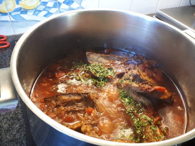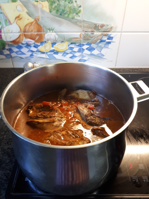 Neem het vlees van de botten, verwijder botjes en vel en snij in grote stukken. Doe in de saus en warm net voor het opdienen op.
