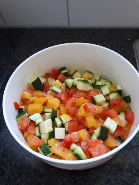 Risotto: 1 sjalot, geut olijfolie, 300 g risottorijst (carnarole of arborio), snuif kurkuma, 1 dl droge witte wijn, 0,8 liter water, 1 groentebouillonblokje, peper, zout, 1 rode paprika, gele en groene courgette, klont boter, 30 g geraspte kaas